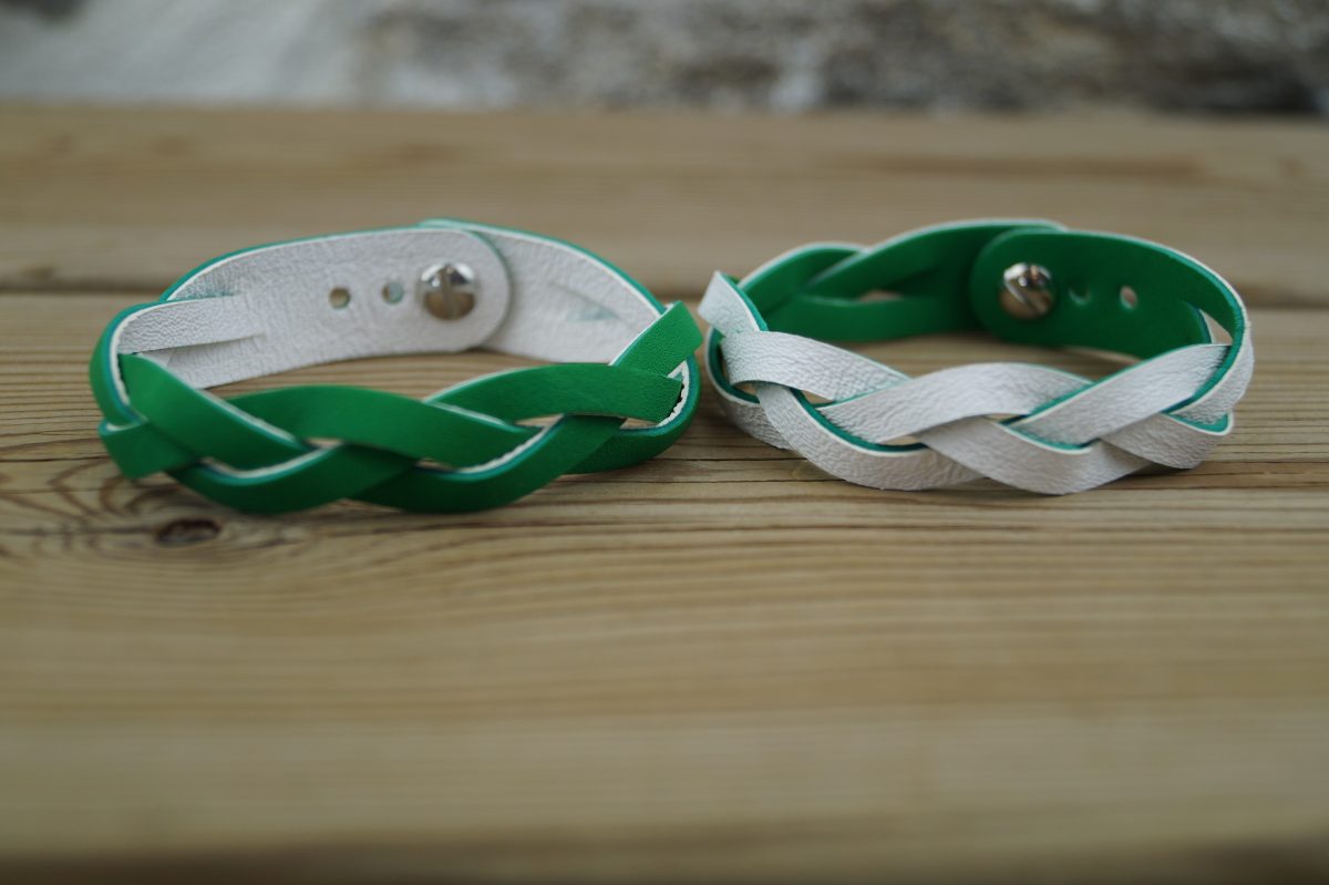 Ces bracelets tressés réversibles et doublés, faits avec un seul cuir d’agneau très doux des deux côtés.